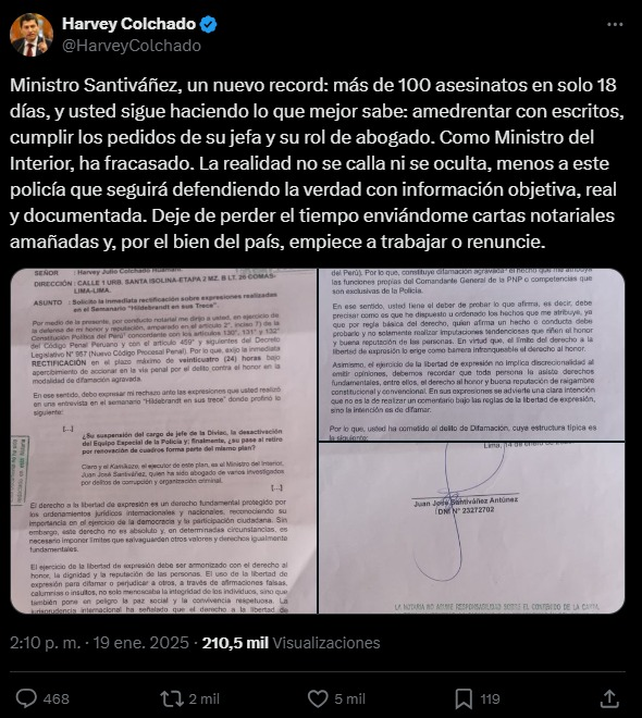"Corruptos, extorsionadores, sicarios, violadores, asesinos y demás, gozan del favor del Gobierno", resaltó. "Dina Boluarte y Santiváñez, el recordado abogado de integrantes de organizaciones criminales, son promotores de leyes pro-crimen y pro-impunidad; con su poder, mantienen bloqueada la potestad de la justicia de ordenar detenciones preliminares, atan a policías y fiscales que quieren trabajar de verdad", publicó Harvey Colchado en su cuenta oficial de X.